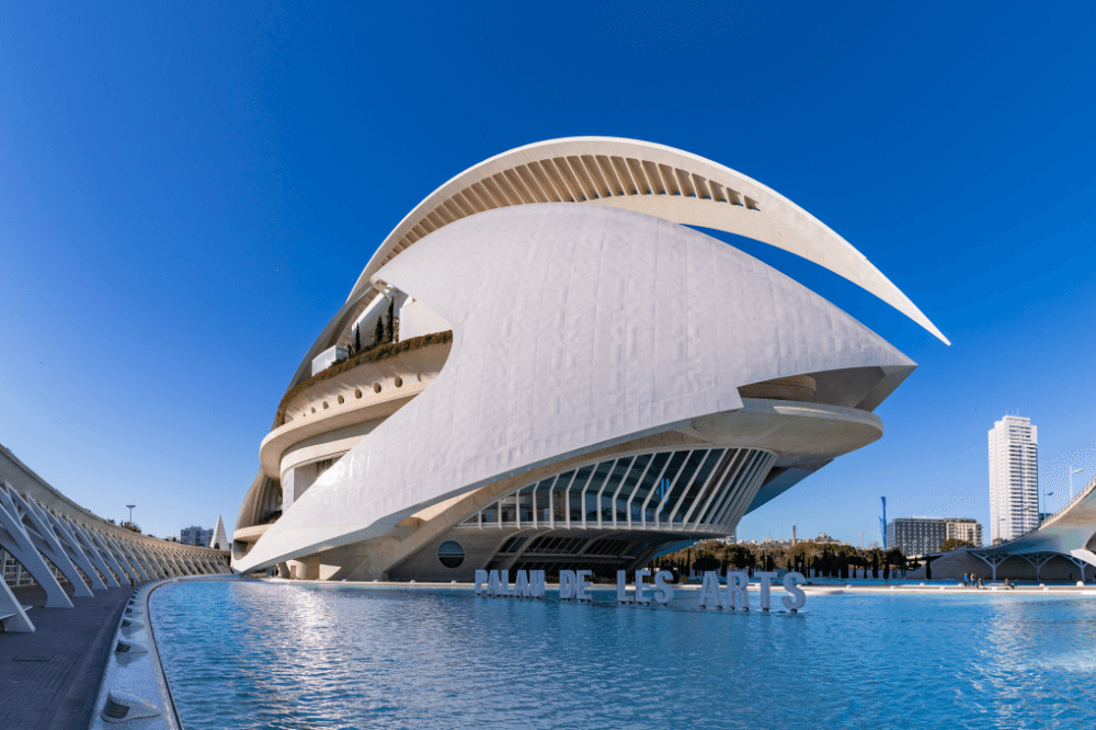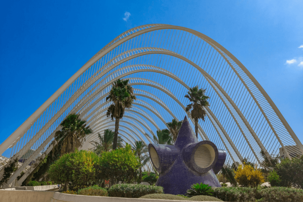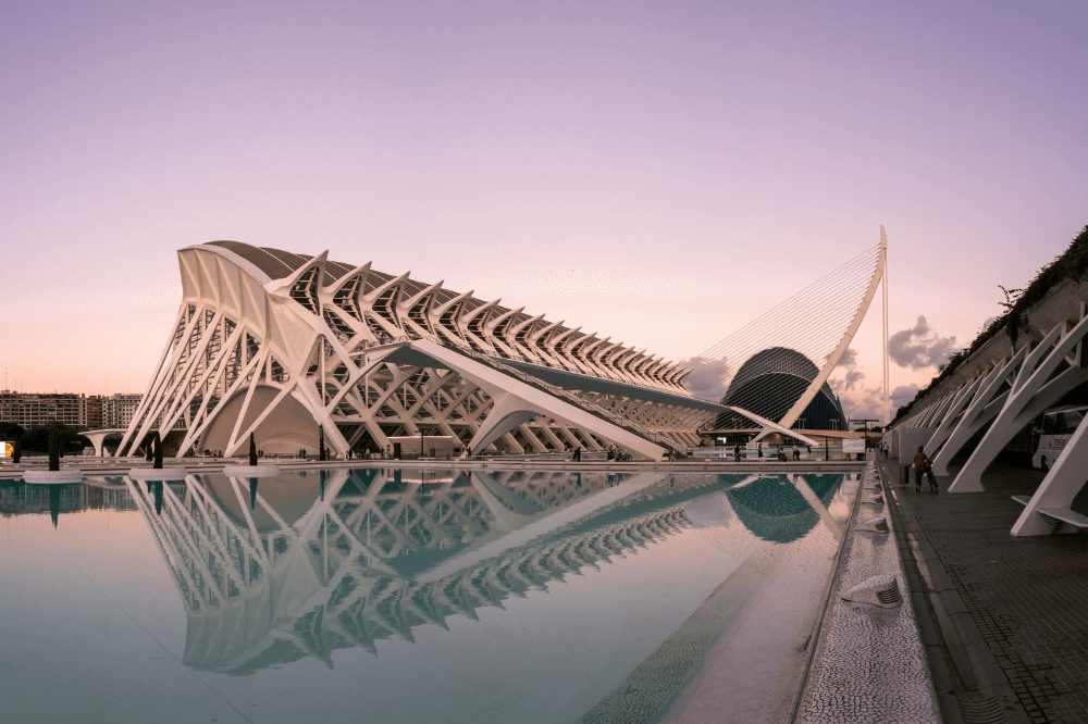 The shape of the buildings evokes animal skeletons and natural forms, creating a futuristic ensemble that has become the symbol of modern Valencia.
