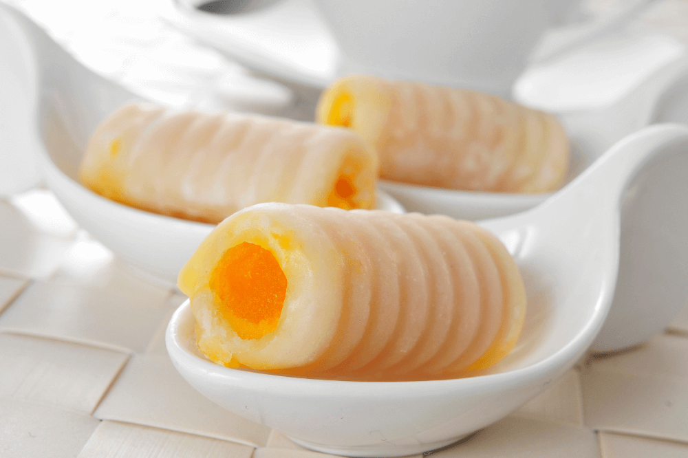 They’re small white or ivory-colored marzipan cylinders filled with a very sweet cream called yema, made from egg yolk and sugar.